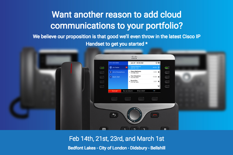 This event will help you gain key insights into how you can take advantage of cloud strategies by offering new services with minimal investment, fronted with your brand. Registration for this event is free, and each company attending will receive one of Cisco’s latest IP handsets to try out our service.